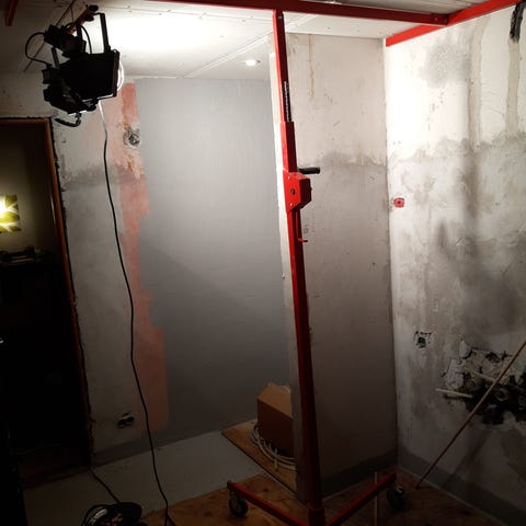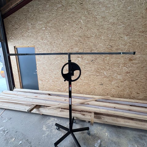 Gipspladeløfter med håndsving til nem og ubesværet håndtering af gipsplader under installation. Designet til at lette løft og placering af plader i loft og væg. Er ikke pæn mere.