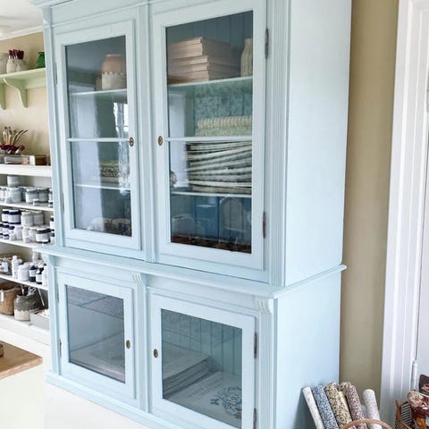 Stort, rummeligt og lækkert vitrineskab med lys. 12 store skuffer. Lidt patina i form af lidt maling som er slået af.