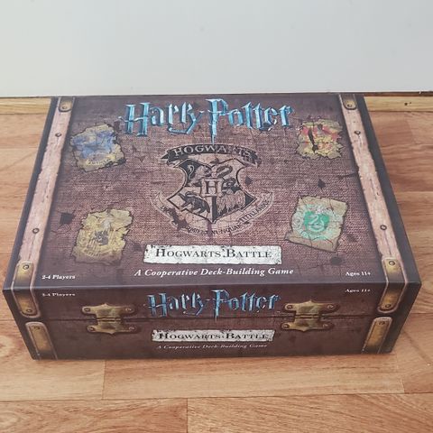 Harry Potter Destination Hogwarts brætspil med spilleplade, kort og spillebrikker. Spillet er baseret på Hogwarts School of Witchcraft and Wizardry og involverer ruter og opgaver relateret til Harry Potter-universet.