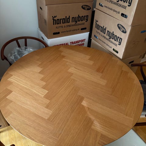 Vi sælger vores runde sildeben spisebord da vi skal flytte.