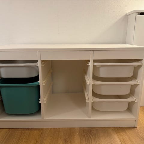 IKEA trofast legetøjs opbevaring med grønne, sorte og hvide skuffer. Der mangler 2 skinner til de store skuffer. Der er brugsspor, se billeder. 99x44x56