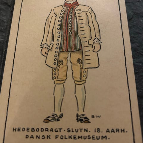 Pæn samling ubrugte tegnede postkort med folkedragter. De første 12 kort er fra Stenders Forlag, serie 5036, signeret "mp". Det er formodentlig tegneren Mikael Pasternak (1905-67), der er tale om. Det ligner i hvert fald hans signatur, men jeg kan ikke dokumentere det yderligere. Desuden er der 5 kort, tegnet af Palle Wennerwald (1898 - 1972) for Grønlunds Kunstforlag. Dertil kommer flere dubletter. Lottet omfatter i alt 27 kort, der sælges samlet. De kan ses i Aarhus.