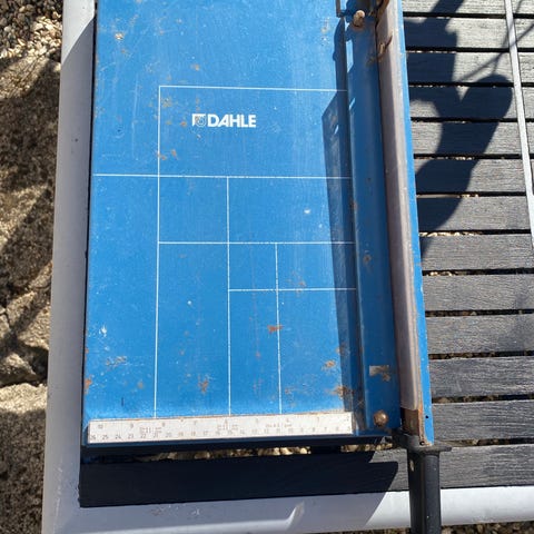 Skærelængde ca. 32 cm (A4). Virker upåklageligt og skærer skarpt.