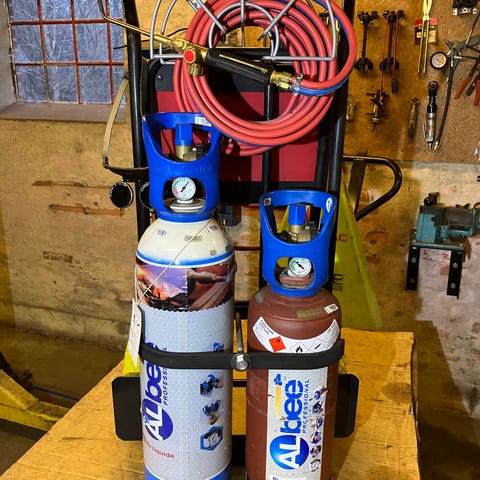 komplet vogn med Nyombyttede portafix 5 liter ejendomsflasker , manometre , lovbefalet tilbageslagsventil på acetylen, 5 meter slange samt x11 brændersæt som indeholder håndtag 2 Str svejsebrændere , skærebrænderhåndtag. 2 Str skæredysser ,rensenåle , svejsebriller og gastænder . Flaskerne, som kan ombyttes hos alle gas grossister er helt fyldte ,plomb er kun pillet for montering af manometre .
