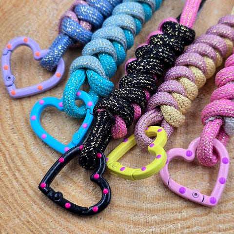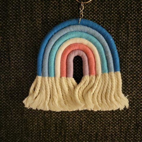 Regnbue nøglering med blå og grønne farver og hvid frynse. Håndlavet design med farverige tråde, egnet til at holde nøgler eller som dekorativt tilbehør.