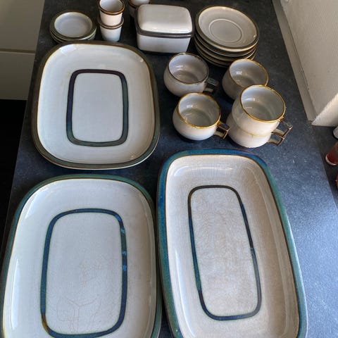 Den 2-armede lysestage, suppeterrinen og skåle nr. 12 A og 230, fad nr. 39 + salt & peber sæt, sennepsbeholder og nr. 20 stort rundt fad er blevet solgt og indgår ikke i den samlede pris.