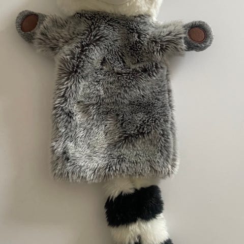 Bjørn hånddukke i form af en vaskebjørn med grå farve. Fremstillet i blødt materiale, egnet til børn.