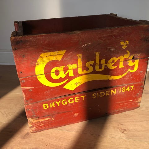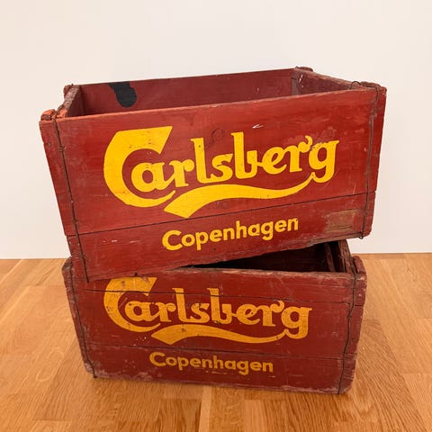 To Carlsberg ølkasser og én Vilhelm Christensen vinkasse.