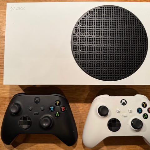Xbox Series S konsol inkl. to controllere, en hvid og en blå. Konsollen har en kompakt og hvid design med sort ventilationsområde. Leveres med kabler til tilslutning.