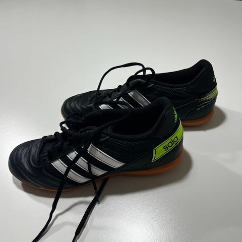 Adidas Fabela Zone indendørs fodboldsko i hvid med sorte striber og gule detaljer. Skoene har en gummisål designet til indendørs brug, hvilket giver godt greb på glatte overflader. Skoene har snørebåndslukning og er velegnede til indendørs fodbold.