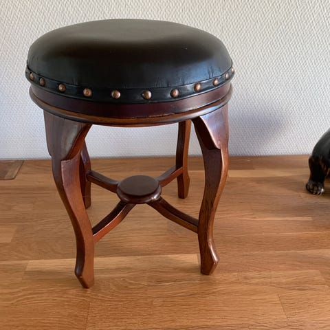 En flot, rund metalskammel i en behagelig lysegrøn farve udbydes hermed til salg. Skamlen har et unikt, perforeret mønster i sædet, som giver et let og retro-inspireret udtryk