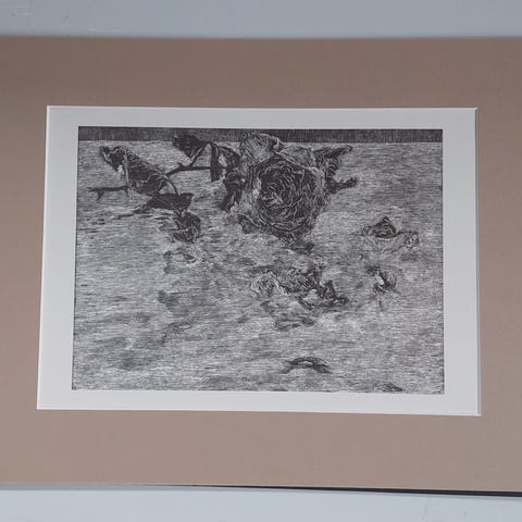 Indrammet radering Maria Thorsen, Gudhjem, f. 1943, medlem af Holkahesten, rose 1982, 1/20, 33x36 cm, til salg i Bornholms Kunsthandel