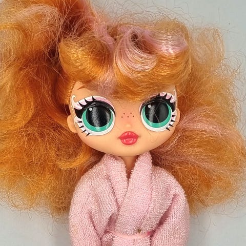 Dukken har en metal arm og sølv make up. Kort blond hår med gult i.