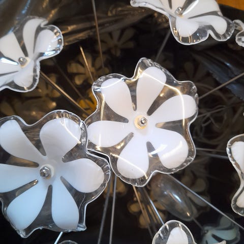 På grund af flytning sælger vi en flot forkromet loftlampe, som består af forkromede pinde med hvide akryl blomster. Den er som ny. Vi sender IKKE og modtager kun kontanter