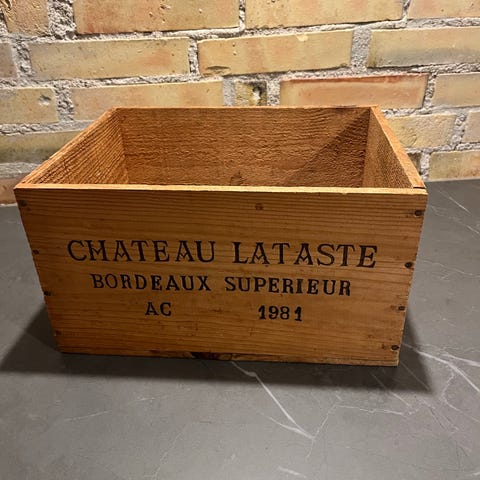 Chateau La Blanquerie trækasse med tryk, årgang 1989. Kassen er lavet af træ og har en naturlig træfarve. Velegnet til opbevaring eller dekorative formål.