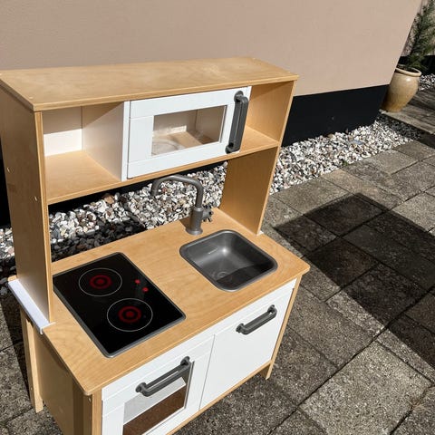 Kogepladelyset kan tændes og slukkes for at give et realistisk lys, men det bliver ikke varmt. Benene kan justeres i tre forskellige højder, så køkkenet kan vokse med barnet. Vasken er aftagelig for nem rengøring.