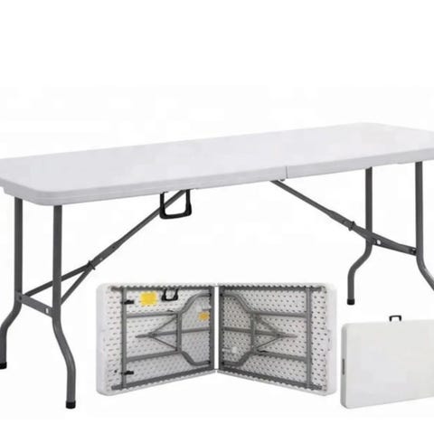 Sælger to af disse lange borde, der er blevet brugt til diverse fødselsdage og fester. Bordene passer i højden - så de udgør et langbord. Bordet er i fin stand, men med diverse pletter og ridser. Kunne muligvis slibes ned? Stellet kan let skrues af, så det kan bæres rundt og opbevares. Bemærk at farven på benene er en smule forskellige (lys grå/hvid).