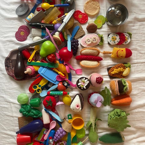 IKEA børnelegetøj bestående af mad og køkkenudstyr i forskellige farver og materialer. Sættet inkluderer plastikmadvarer som brød, grøntsager, frugt, kager samt køkkenredskaber som kagerulle, skeer og en brødrister. Egnet til rolleleg og udvikling af motoriske færdigheder.