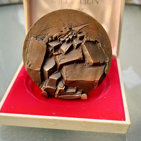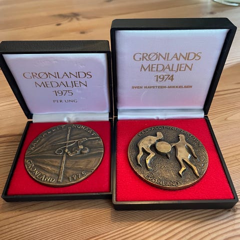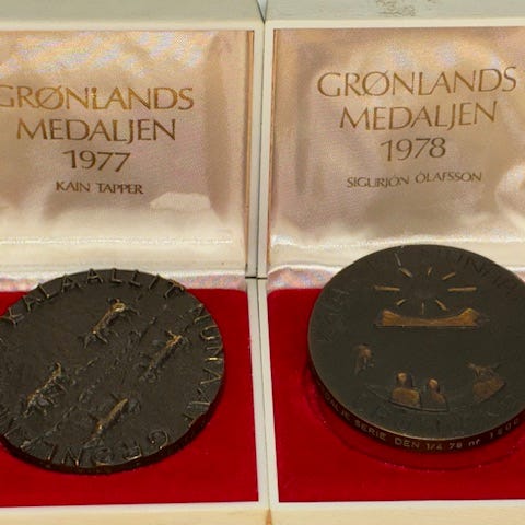 Dette er Grønlandsmedaljen fra 1973, udført af den finske billedhugger Eila Hiltunen.