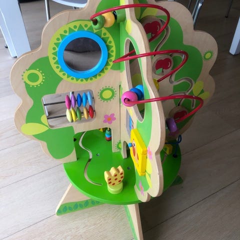 Søgeord: bord / børnebord / aktivitetslegetøj / aktivitetsstativ / aktivitetsbord / togbane / togvogn / tog / vogn / gåvogn / ko / træ / træbord / trælegetøj / baby / dyr /