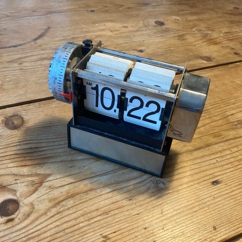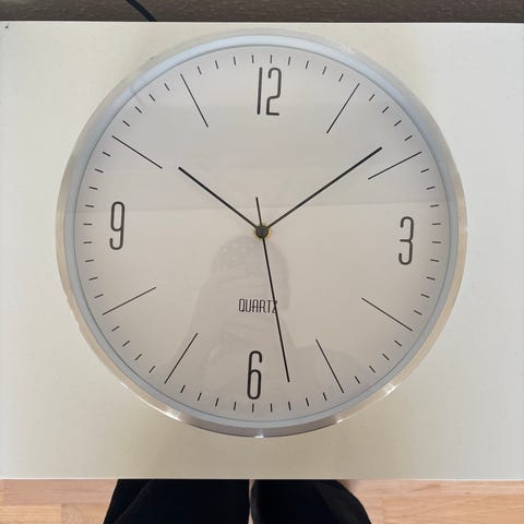Vægur med en front i træ og sorte time- og minutmarkeringer. Uret har gyldne visere og en sort bagside med batteridrevet urværk. Designet er enkelt og funktionelt.