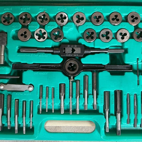 Gevindskæresæt bestående af seks gevindskærere i forskellige størrelser samt et håndtag. Sættet er placeret i en orange opbevaringsboks og egnet til manuel gevindskæring i metal eller lignende materialer. Aldrig anvendt.