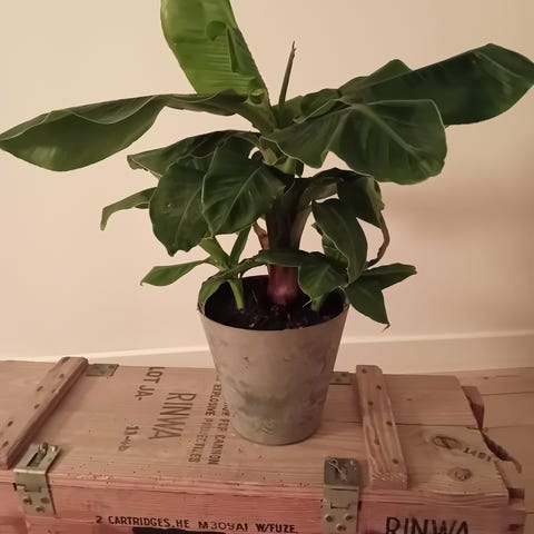 3 stk bananpalmer netop omplantet fra anden plante. Bananpalmen bør vandes ca. 1-2 gange om ugen, når jorden er ved at tørre ud. Den ynder en solrig plads.
