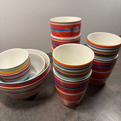Meny krus 6 stk. i hvid porcelæn med sort bølget linjedekoration. Krusene er designet til daglig brug og kan anvendes til varme og kolde drikke. 2 stk. skåle og en krukke