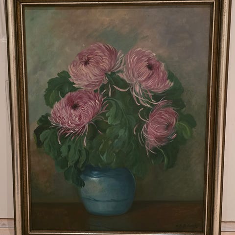 Originalt håndmalet oliemaleri på lærred med klassisk blomsterstilleben.