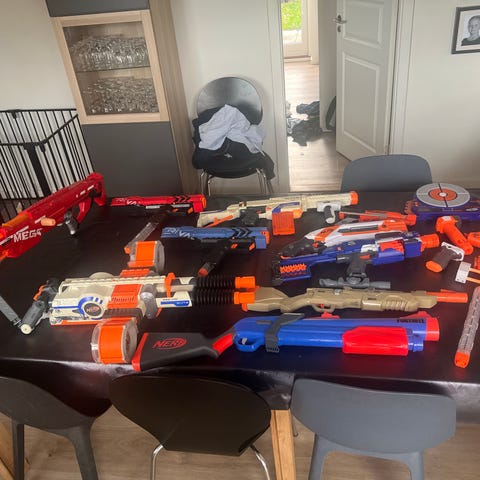 Nerf legetøjsvåben sæt inklusive flere forskellige blastere, skudsikker brille, skydeskiver og et stort antal skumskud. Sættet indeholder våben i forskellige farver som blå, grøn, orange og rød, designet til leg og målskydning. Materialet er plast, egnet til børn.
