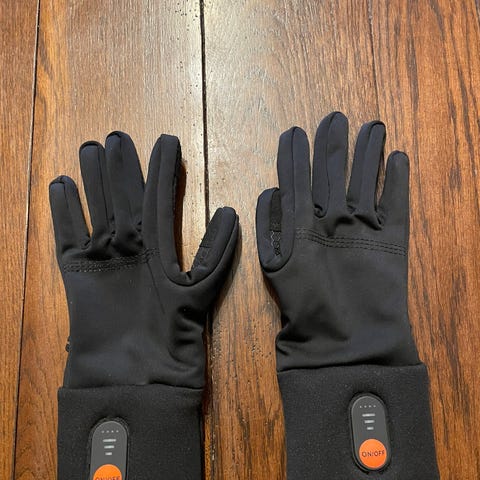 Handsker med varme fra batterier (genopladelige). Handskerne kun brugt en gang og derfor som helt nye (købsnota medfølger).