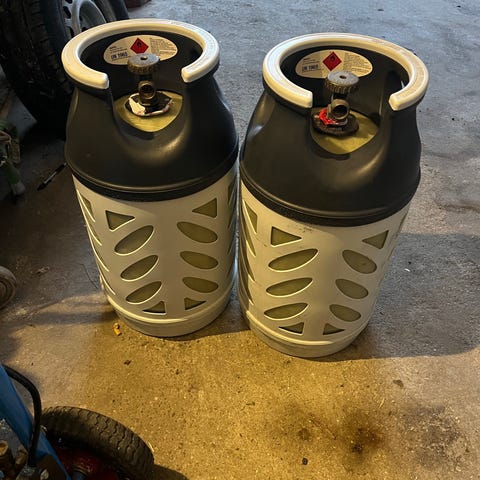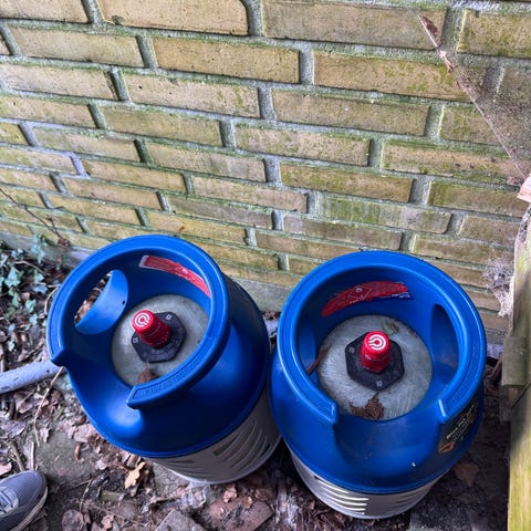 Campingaz Propanflaske med kapacitet på 5 kg. Flasken har en blå og grå farve og er designet til opbevaring og brug af propangas.
