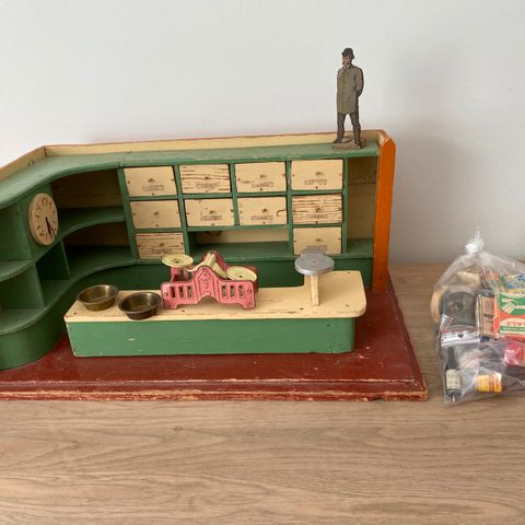 Vi sælger denne søde lille købmandsbutik ☺️Der medfølger diverse grøntsager, frugt, ost, konservesdåser samt et kasseapparat med sedler og mønter.