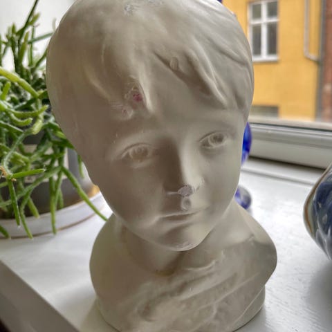 Unik og lidt creepy buste udført i noget, der ligner en blanding af gips og epoxy sælges. Den måler ca. 40 cm i højden.