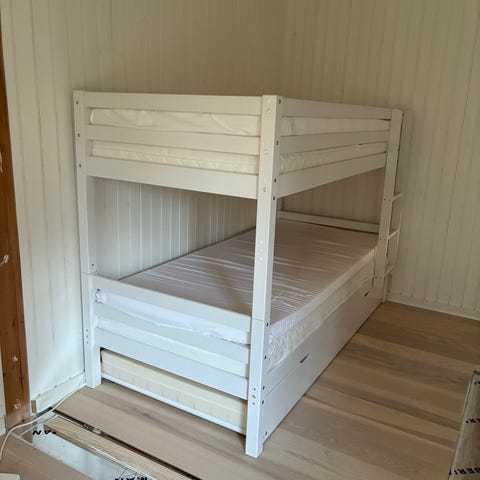 Vi har malet køjesengen med hvid lasur maling, så den fremstår lys, men man stadig kan se træets årer.