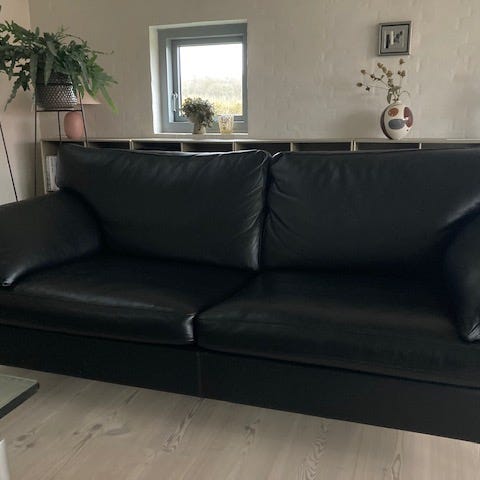 Cognacfarvet 3-personers lædersofa, Søren Lund. Sofaen har gode formfaste hynder, men har overfladiske tynde ridser. Kan pudses op, så den ser næsten ny ud. Nyprisen var ca. 35.000.