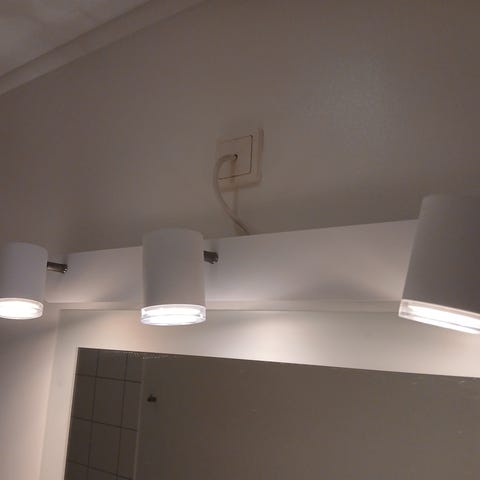 Fine væglamper med hvid (varm/kold) og fuld farve. Har hængt under halvtag i indkørsel i 2 år og har stået på en hylde indendørs siden. Købt i 2021. Fungerer som de skal og er uden skader, ridser eller lign