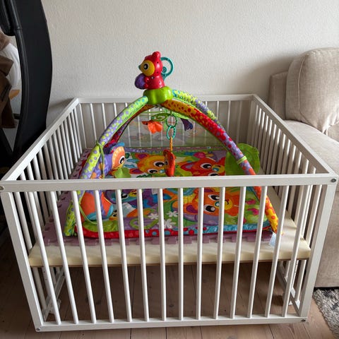 Medfølgende: madras og aktivitetsrand samt elektronisk uro med melodier.
