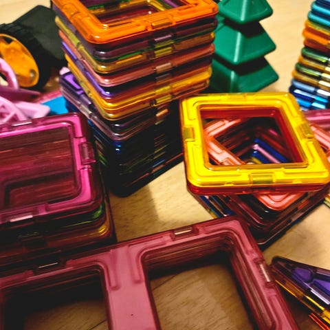 Sæt med 45 kvadratiske dele, 28 trekantede, 3 kvadrater med sæde/barn, 2 sekskanter og to hjul. Dertil en fod til pariserhjul, men her mangler nogle dele. 2 byggemanualer.