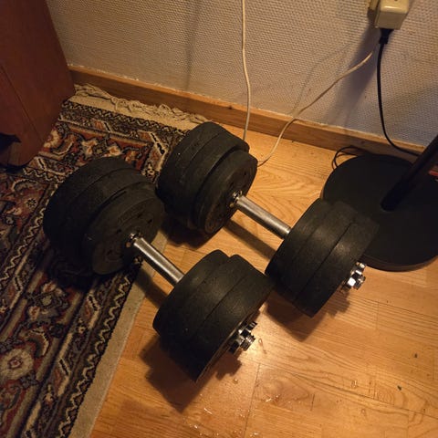Komplet sæt træningsudstyr bestående af vægtstænger, håndvægte, vægtskiver og låsemekanismer. Materiale i metal med polstrede håndtag på nogle af stængerne. Egnet til styrketræning og vægtløftning i hjemmet. Hjemmebygget bænk. Gummimåtte følger med.