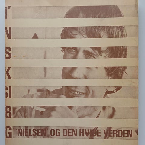 Hans-Jørgen Nielsen Eksempler bog med blåt og gult omslag. Bogen indeholder tekster og digte på dansk. Den er et fysisk eksemplar med sider, der viser brug og alderstegn.