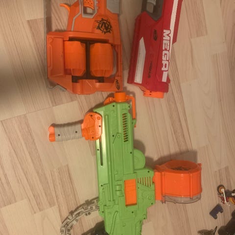 2 x Nerf gun og 1 x X Shot, alle mekaniske så man slipper for besværet med batterier.