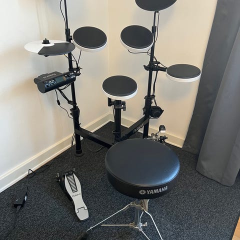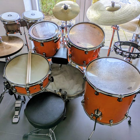 Fedt sæt i birk som er blevet købt til at lære at spille trommer på.