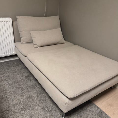 Stolen er brugt og har normale brugsspor, herunder lette folder i sædet (ses på billederne), men ingen huller eller skader. Ryg og armlæn er stabile, og den er stadig rigtig behagelig at sidde og ligge i.