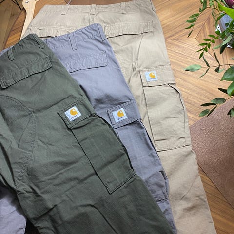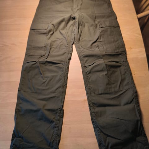 Carhartt Regular Cargo Bukser i størrelse 34/32 i farven cypress rinsed. Bukserne har flere lommer.