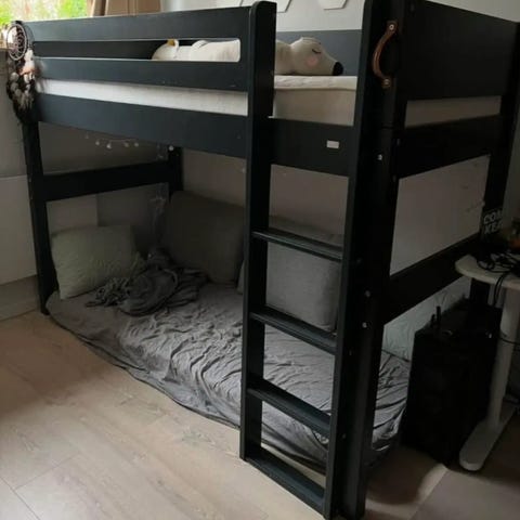 Højseng 90x200 som også kan skilles af, så den bliver til almindelig seng. Der følger skummadras med. Sengen er skilt af og klar til afhentning. Har ikke et billede af sengen samlet, men billedet der er vedhæftet er sådan den ser ud og den er højre og flere trin.