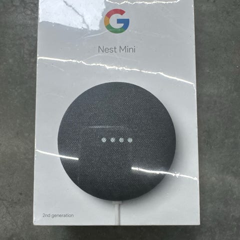 Google Nest Hub smart home display i grå farve. Enhed med skærm til styring af smarthome-funktioner, visning af information og medieafspilning. Inkluderer strømadapter og kabler.