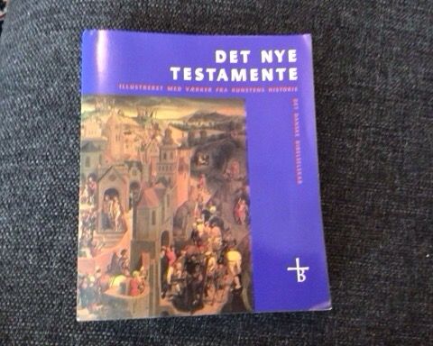 Det Nye Testamente bog med tekst på dansk. Bogens omslag er mørkeblåt med guldtryk på forsiden. Indeholder den kristne bibels nye testamente.