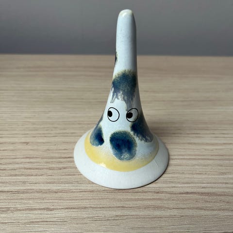 Arhøj Keramik figur fra serien Familia i blågrøn og hvid farve. Figuren har et enkelt og stiliseret design med øjne malet på fronten. Den er håndholdt størrelse, der passer til dekoration i hjemmet.