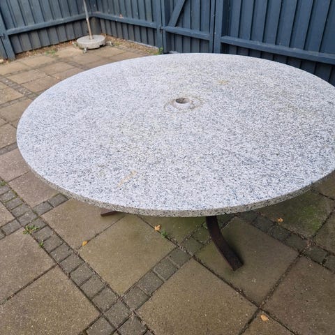 Elegant rundt Kerteminde havebord i moderne design. Hvidt aluminiumsstel kombineret med teakbordplade i solmønster. Giver terrassen eller haven et eksklusivt udtryk.